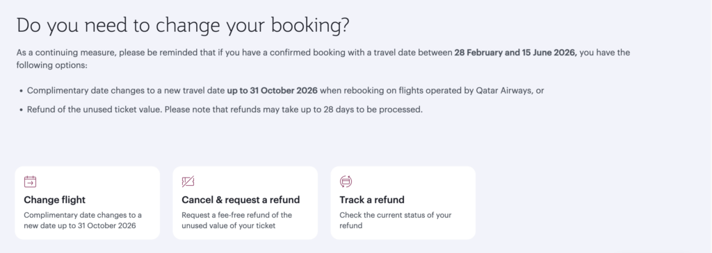 A Qatar Airways prorrogou sua política de flexibilidade para remarcação e reembolso de passagens. A medida agora vale para voos com datas entre 28 de fevereiro e 15 de junho, que podem ser remarcadas para voos até o dia 31 de outubro de 2026.