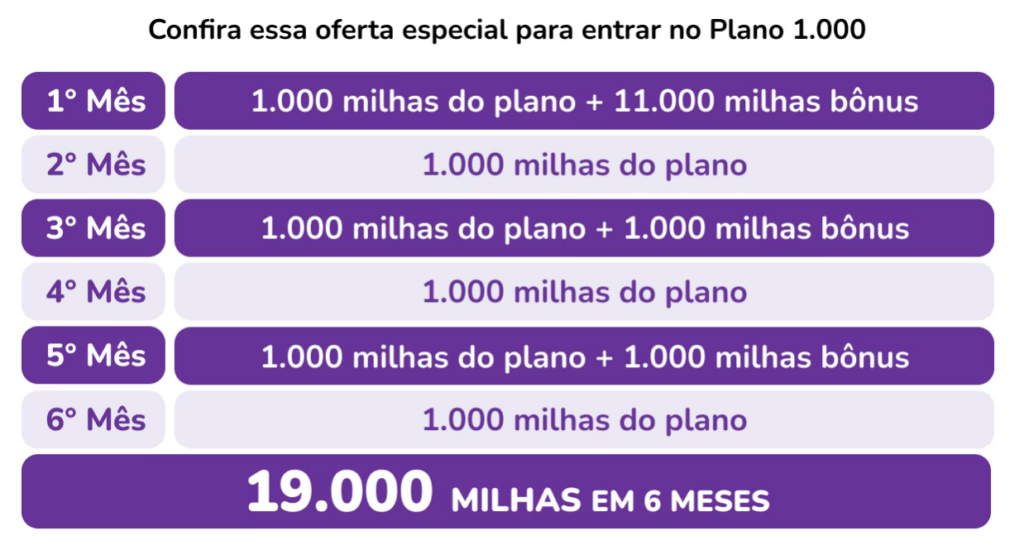 - Quantidade de milhas acumuladas em 6 meses: 19.000 milhas (6.000 das mensalidades + 13.000 das bonificações recebidas)