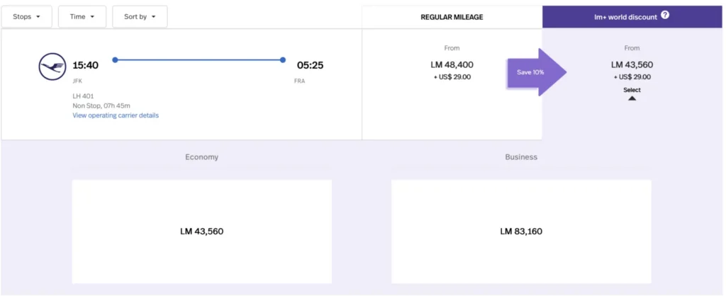 Um voo na executiva da Lufthansa, de Nova York (JFK) com destino a Frankfurt (FRA), aparece por 83.160 milhas LifeMiles, enquanto a tabela do programa precifica esta emissão em 63.000 milhas.