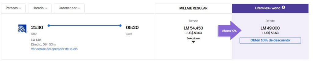 Outro exemplo a partir de São Paulo, agora com destino aos Estados Unidos. Um voo de Guarulhos para Nova York (EWR), na econômica da United, agora está custando 54.450 milhas, e não mais as 35.000 milhas que constam na tabela fixa do LifeMiles. Ou seja, o preço da emissão subiu mais de 55%, e está custando basicamente o que antes custava uma emissão em classe executiva, 60.000.