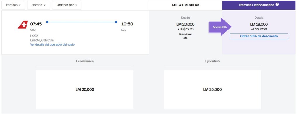 Apesar da alta generalizada, nem todas as emissões sofreram mudanças. Em voos aqui pela América Latina, a situação parece estar sob controle. A emissão São Paulo (GRU) – Buenos Aires (EZE) está aparecendo com o mesmo valor que consta na tabela: 20.000 em econômica e 35.000 em executiva, para voar com a SWISS.