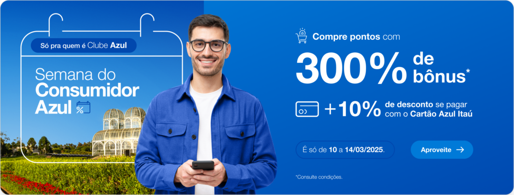O Azul Fidelidade está com uma nova oferta durante a Semana do Consumidor, onde oferece até 300% de bônus na compra de pontos para assinantes do Clube Azul. A promoção é válida apenas até 14 de março. Confira os detalhes abaixo.