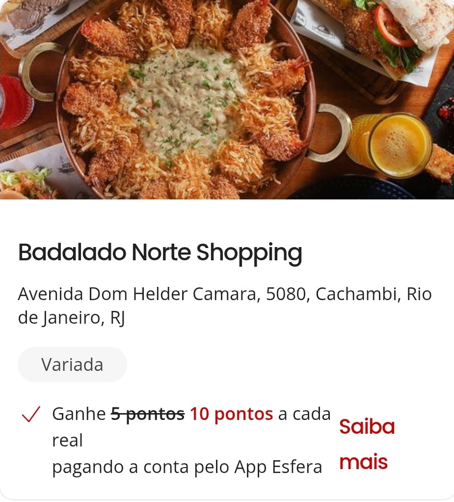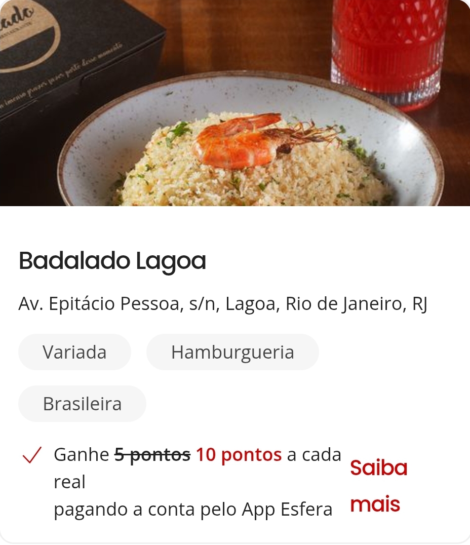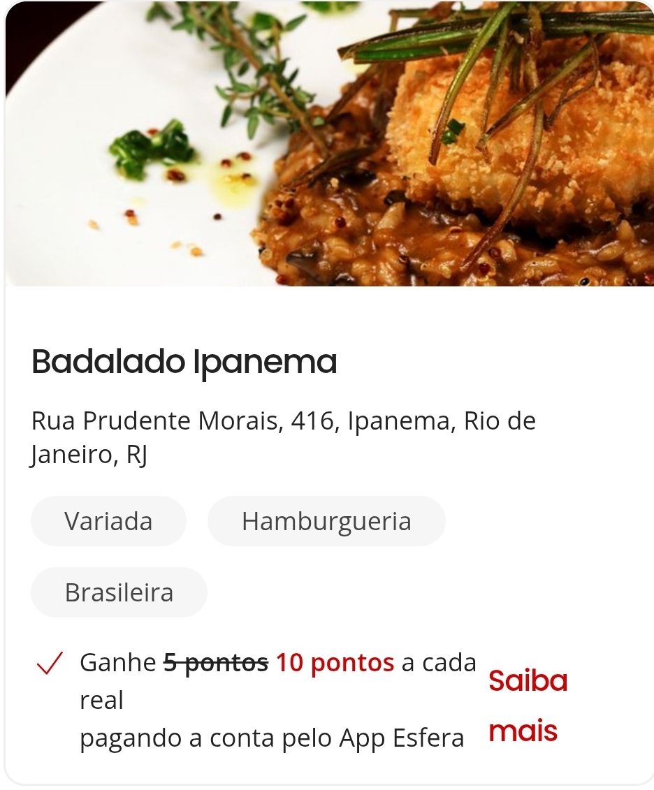 Quando você efetua uma reserva ou faz check-in nos restaurantes listados e paga a conta através do aplicativo Esfera estará habilitado para ganhar até 10 pontos Esfera a cada real gasto.