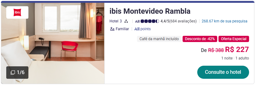 Os hotéis participantes levam o sele de “Oferta Especial” logo ao lado do desconto oferecido para reserva naquela data. No exemplo a seguir temos o ibis Montevideo Rambla com 42% OFF.