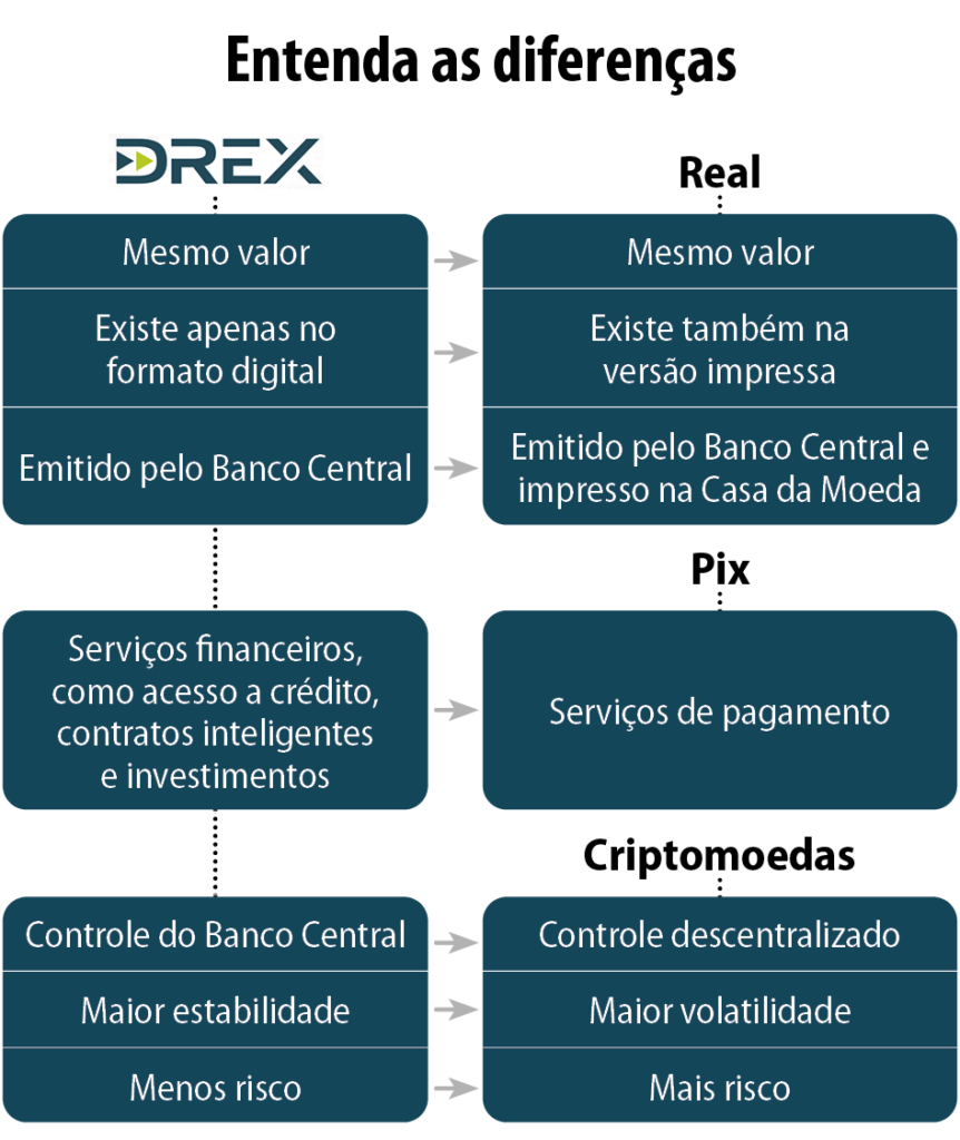 O Drex terá o mesmo valor do real tradicional, será regulado pelo Banco Central e emitido apenas na própria plataforma. Deve permitir vários tipos de transações financeiras seguras com ativos digitais. Para ter acesso a essa plataforma, o cidadão precisará de um intermediário financeiro autorizado, como um banco, que fará a transferência do dinheiro depositado em conta para a carteira digital.