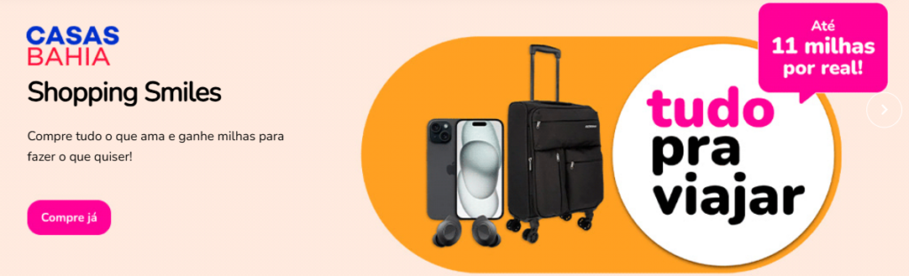Continuando com a rodada de promoções “Tudo pra viajar”, o Shopping Smiles e a Casas Bahia estão com uma oferta, em que é possível ganhar até 11 milhas por real gasto em compras online. Oferta válida até amanhã, dia 30 de maio. Vamos aos detalhes!