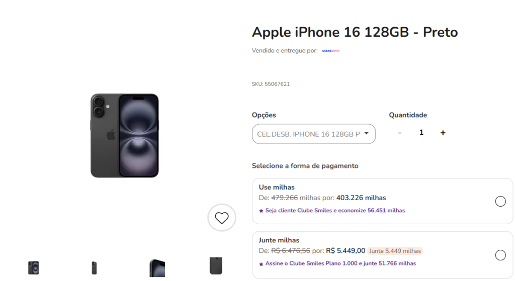 Na compra do iPhone 16 128GB – Preto, considerando a pontuação base (9,5 milhas), é possível acumular 51.765 milhas Smiles nesta promoção. Já os assinantes do Clube 20.000 ou Clientes Diamante recebem 60.489 milhas Smiles (11 milhas).