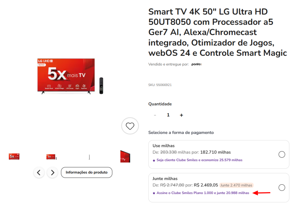 Na compra da Smart TV, considerando a pontuação base (8,5 milhas), é possível acumular 20.988 milhas Smiles nesta promoção. Já os assinantes do Clube 20.000 ou Clientes Diamante recebem 24.690 milhas Smiles (10 milhas).