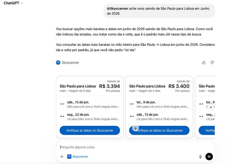 O usuário entra na loja de aplicativos do ChatGPT, instala o app do Skyscanner e começa a fazer buscas usando linguagem natural. Não há formulários complicados ou múltiplas abas para preencher.