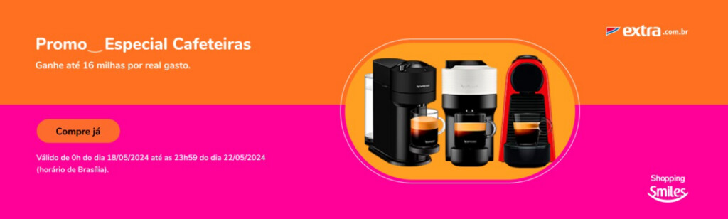 Smiles e Extra começaram a semana oferecendo a seus clientes até 16 milhas por real gasto em cafeteiras selecionadas. Esta oferta é válida até o dia 22 de maio e os detalhes você confere na sequência.