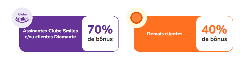 - 70% de bônus – Clientes Diamante e/ou Clube Smiles
