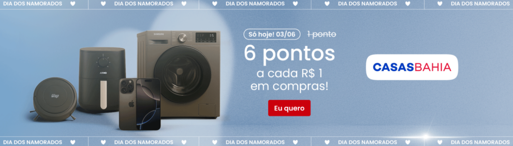 Somente hoje, 3 de junho, a Esfera está com uma oferta especial que oferece 6 pontos por real gasto em produtos vendidos e entregues pela Casas Bahia. Confira os detalhes dessa oferta e aproveite!