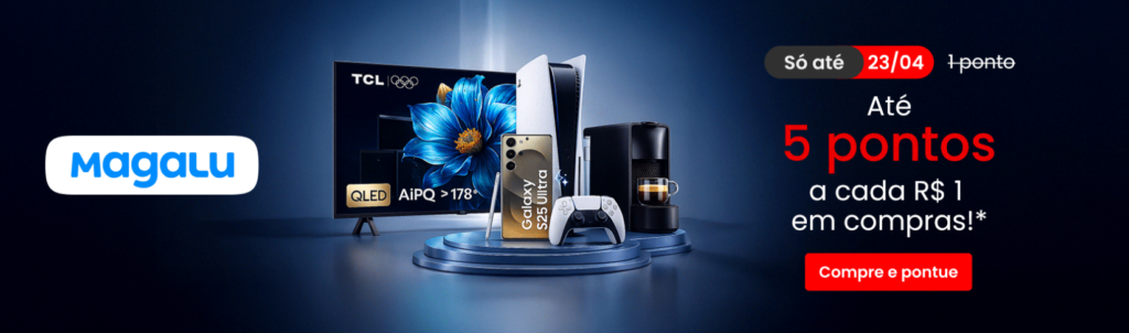 Precisando ir às compras? Nesta oferta da Esfera, os clientes podem acumular 5 pontos por real gasto em produtos vendidos e entregues pelo Magalu ou 2 pontos por real gasto em compras realizadas em lojas parceiras. A oferta é válida somente hoje, 23 de abril.