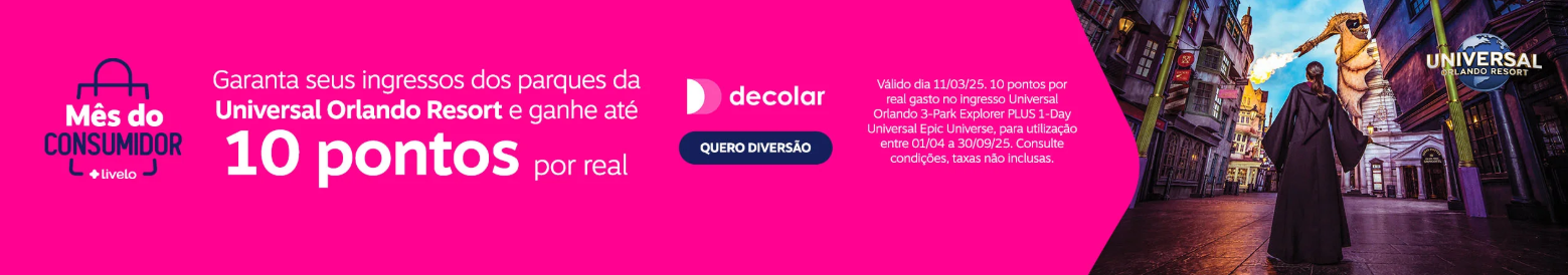 Quer conhecer os parques da Universal em Orlando? Aproveite a promoção exclusiva da Livelo com a Decolar e ganhe 10 pontos por real gasto em ingressos. Mas aproveite, pois a oferta é válida somente hoje, 11 de março! Confira os detalhes a seguir.