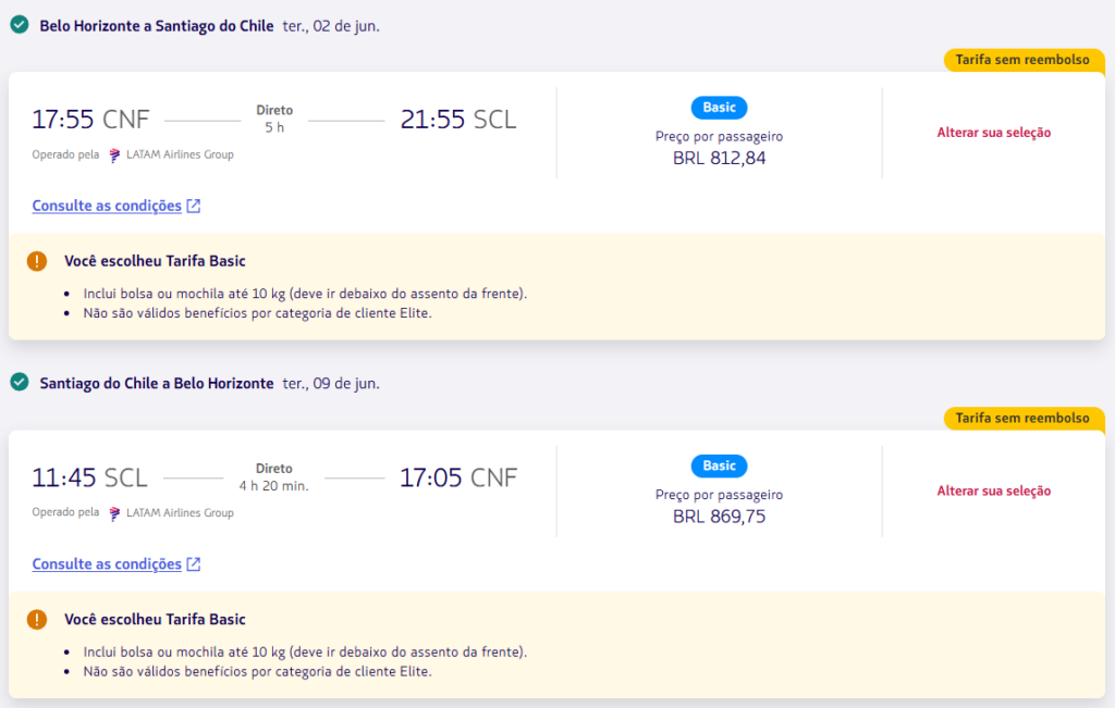 | Belo Horizonte (CNF) | Santiago (SCL) | Economy (basic) | R$ 1.682,59 | Belo Horizonte (CNF) | Santiago (SCL) | Premium Economy | R$ 2.607,01 |