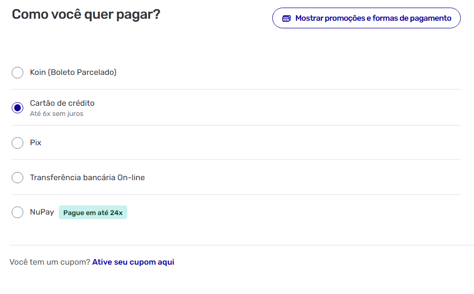 - Role a tela até encontrar o campo “Ative seu cupom aqui”.
