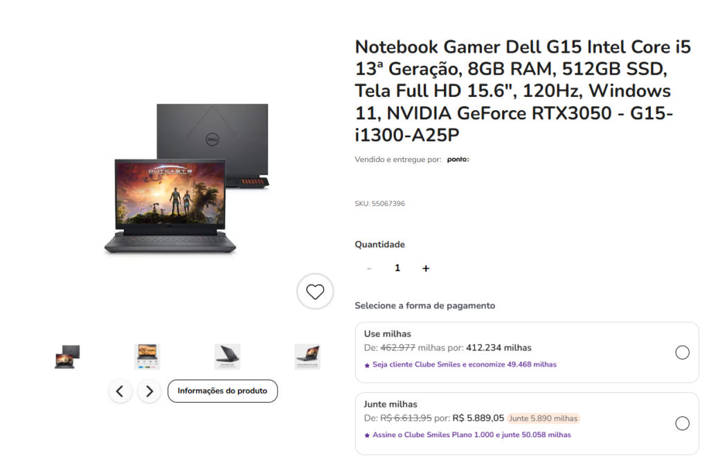 Na compra do Notebook Gamer Dell, considerando a pontuação base (8,5 milhas), é possível acumular 50.058 milhas Smiles nesta promoção. Já os assinantes do Clube 20.000 ou Clientes Diamante recebem 58.890 milhas Smiles (10 milhas).