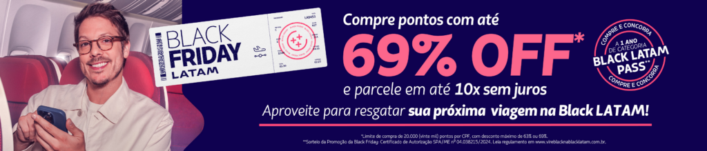 Hoje termina a promoção de Black Friday do LATAM Pass, em que oferece aos seus clientes até 69% de desconto na compra de até 20 mil pontos e parcelamento em até 10x sem juros. Vamos aos detalhes!
